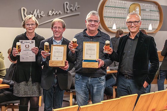 Neben der Prämierung bot die Veranstaltung den Teilnehmern auch wertvolle fachliche Impulse. So referierte Sebastian Thielen vom DLR Eifel über optimale Anbaumethoden für stabile Erträge im Braugerstenanbau, während Christian Oberhausen (ebenfalls DLR Eifel) den Erntebericht 2025 präsentierte. Nach einem anfangs sehr trockenen Jahr entwickelte sich die Ernte letztendlich positiv. „Das Jahr hat gezeigt, dass die Braugerste eine Kultur ist, die gut mit Trockenheit umgehen kann", so Oberhausen – eine wichtige Eigenschaft angesichts des Klimawandels. Anschließend überreichten Dr. Anja Stumpe, Dienststellenleiterin des DLR Eifel, und Markus Spanier zahlreiche Preise und Urkunden an die Teilnehmer. Beim abschließenden Umtrunk hatten Erzeuger, Mitarbeiter der Bitburger Brauerei und des DLR Eifel bei bester Verpflegung noch die Gelegenheit, sich in informeller Runde auszutauschen.